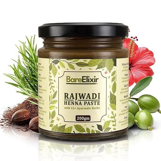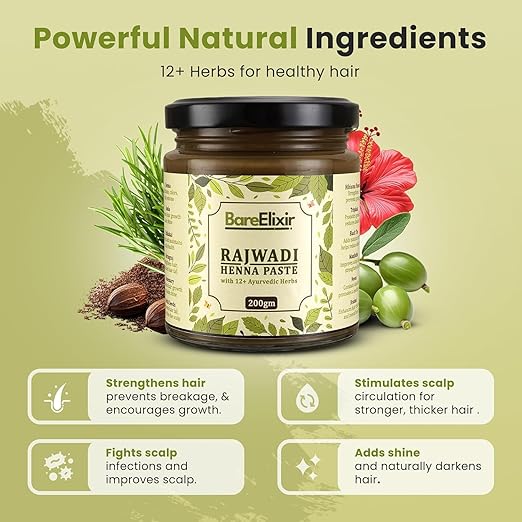 Bare Elixir Henna Paste | Pre-Soaked in Black Tea & 12+ Ayurvedic Herbs | 100% Natural Rajasthani Sojat Henna for Hair | Ready-to-Use, Chemical-Free Henna for Men & Women | Rich Brown Hair Color | Pure Herbal Mehndi for Nourished & Naturally Colored Hair (200gm x 2)