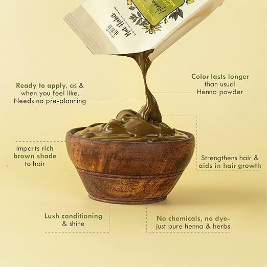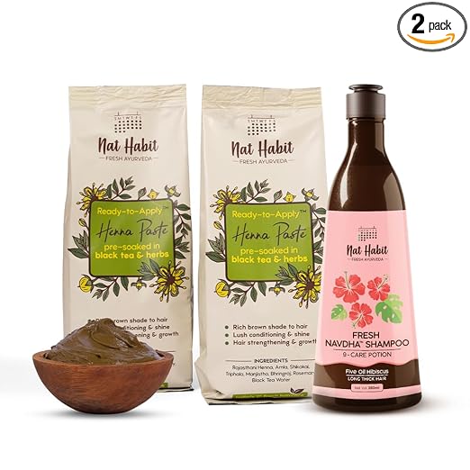 Nat Habit Fresh Ready-To-Apply Henna Paste & Five Oil Hibiscus Shampoo for Long Thick Hair, Hair Growth & Conditioning With Rich Dark Brown Color (Pack of 2x220g and 250ml)